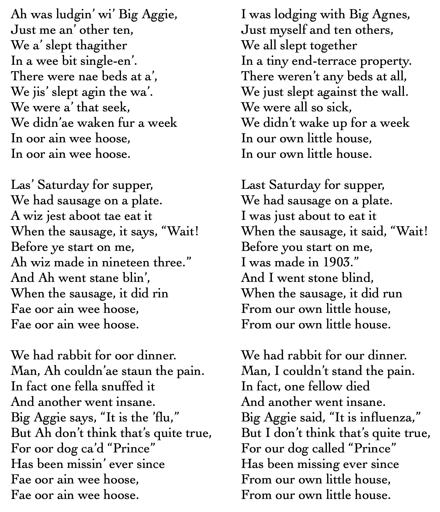 The embedded starting point is the beginning of the song whose lyric you can find below, but take the opportunity to explore the rest of the record: weep at loves lost, spit at cheeky gallus lads who take advantage of a coy little lassie; hear about the three (and only three) crows that once sat upon a wall on a cold and frosty morning, and take warning: you can’t shove your grannie off a bus.