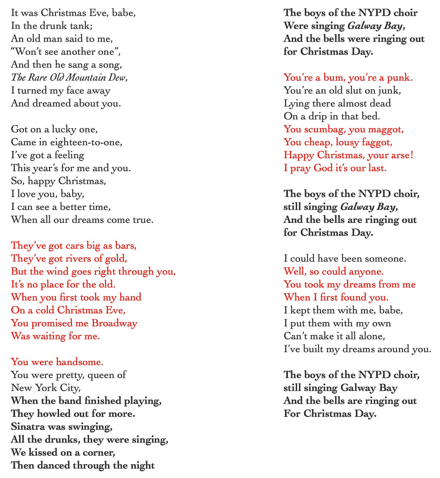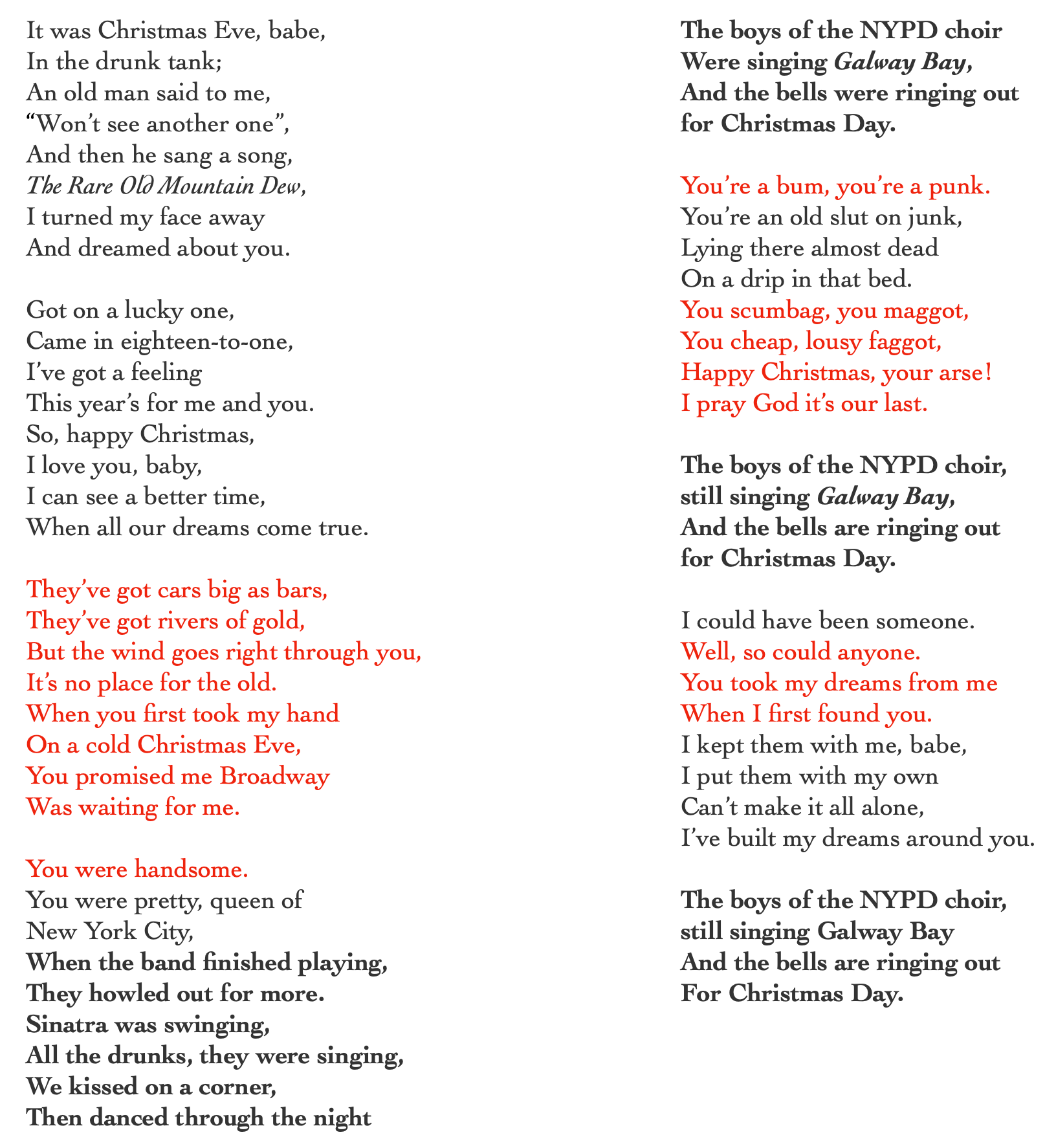 The lyric is shared: plain black indicates MacGowan, red MacColl, and bold black type indicates the two of them in unison.