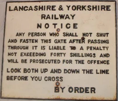 Bolted to the outside wall of my home is a rather heavy reproduction of a sign the likes of which would at one time in the dim and distant past have graced some location on the Lancashire and Yorkshire Railway. It reads: Notice. Any person who shall not shut and fasten this gate after passing through it is liable to a penalty not exceeding forty shillings and will be prosecuted for the offence. Look both up and down the line before you cross. By Order.