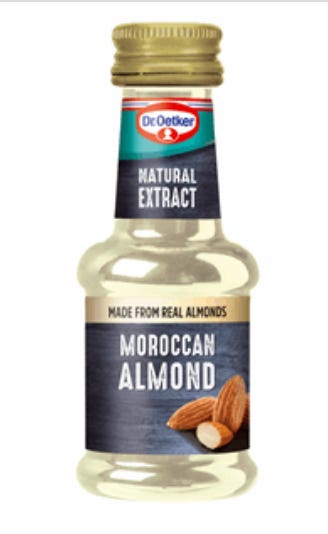 Not only do the almonds in Dr Oetker’s almond extract come from Morocco, but they are also real. No fake Moroccan almonds. What’s an extract, whilst we’re here? And how much stronger, or weaker, is it than an essence? Now that’s something they won’t readily tell you.